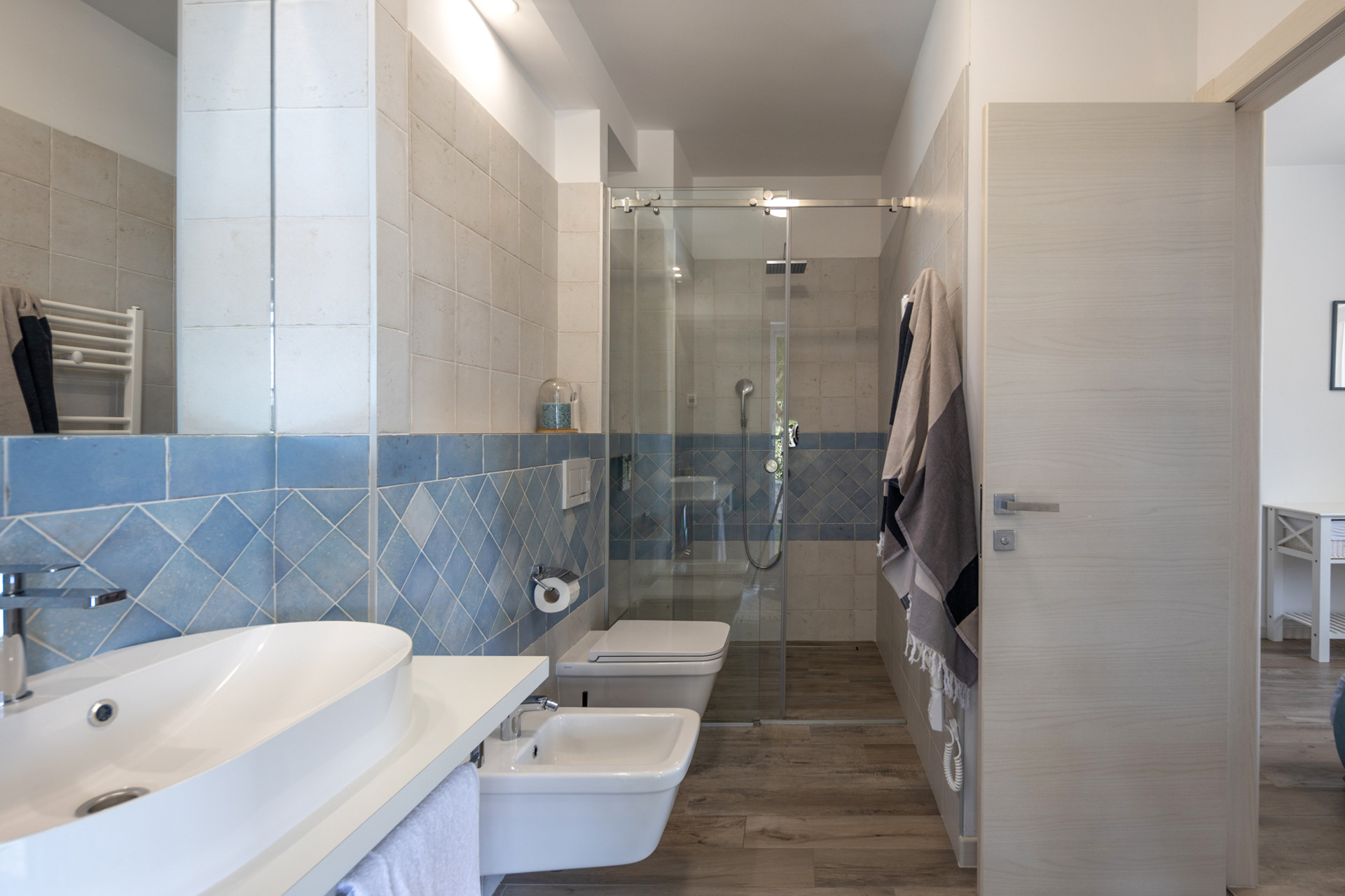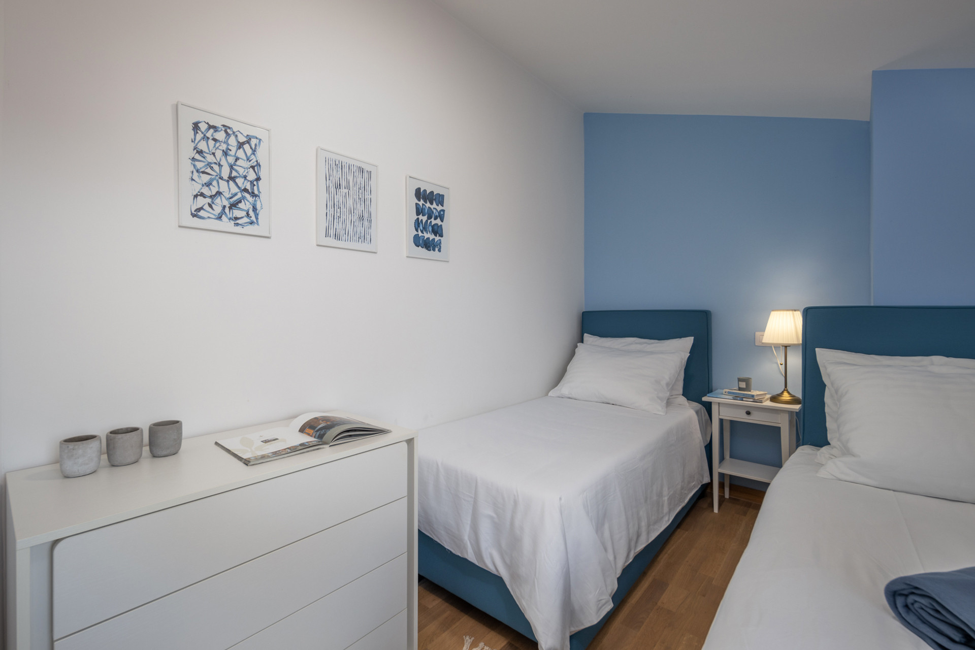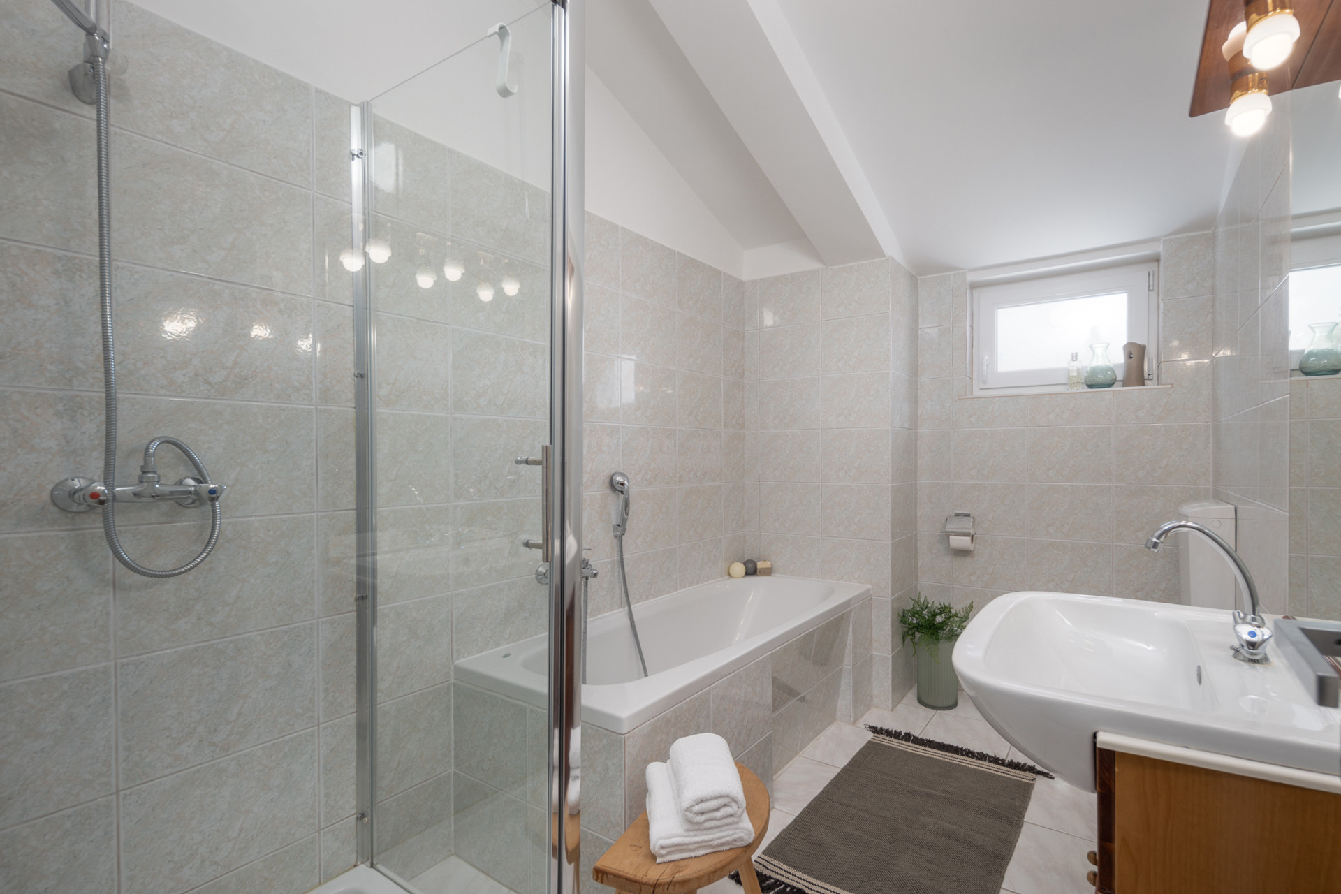 The villa offers 600m2 of living space with 4 comfortable bedrooms – three with double beds and one with two single beds. A baby cot is also available for families with small children. Villa Bandela features 3 bathrooms: one with a bathtub and two en-suite with showers, as well as a separate guest toilet. Guests can also enjoy practical household facilities such as a washing machine, iron, air conditioning, and Wi-Fi.