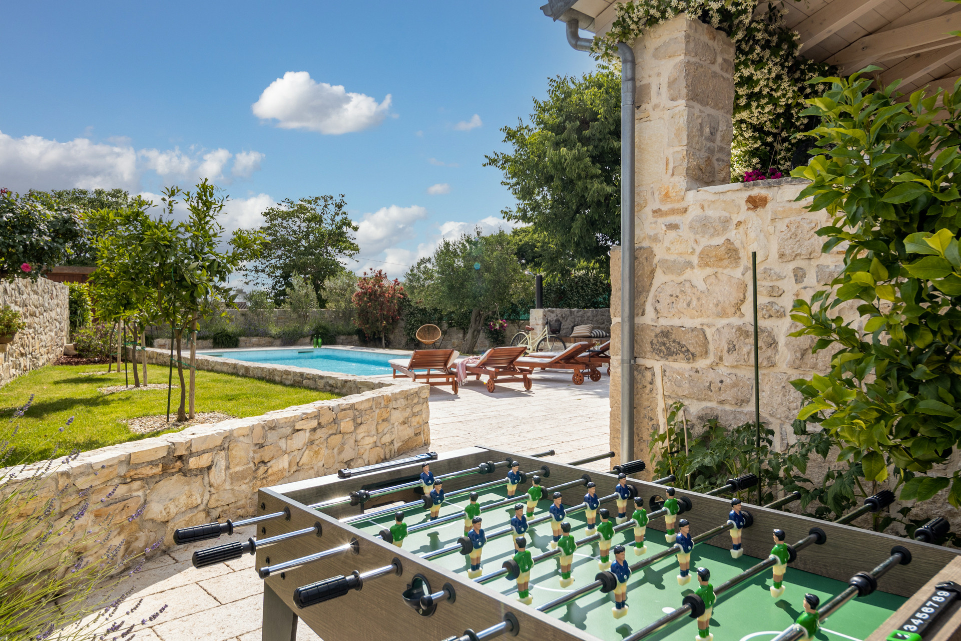 The villa’s highlight is the private heated pool of 32m2 surrounded by comfortable sun loungers. A shaded terrace overlooking the pool offers the perfect setting for al fresco dining. Guests are welcome to pick fresh fruit and vegetables from the villa’s private garden. For entertainment, there is table football, a children’s swing, a hammock, and bicycles available. The villa also offers five private parking spaces, ensuring convenience throughout your stay.