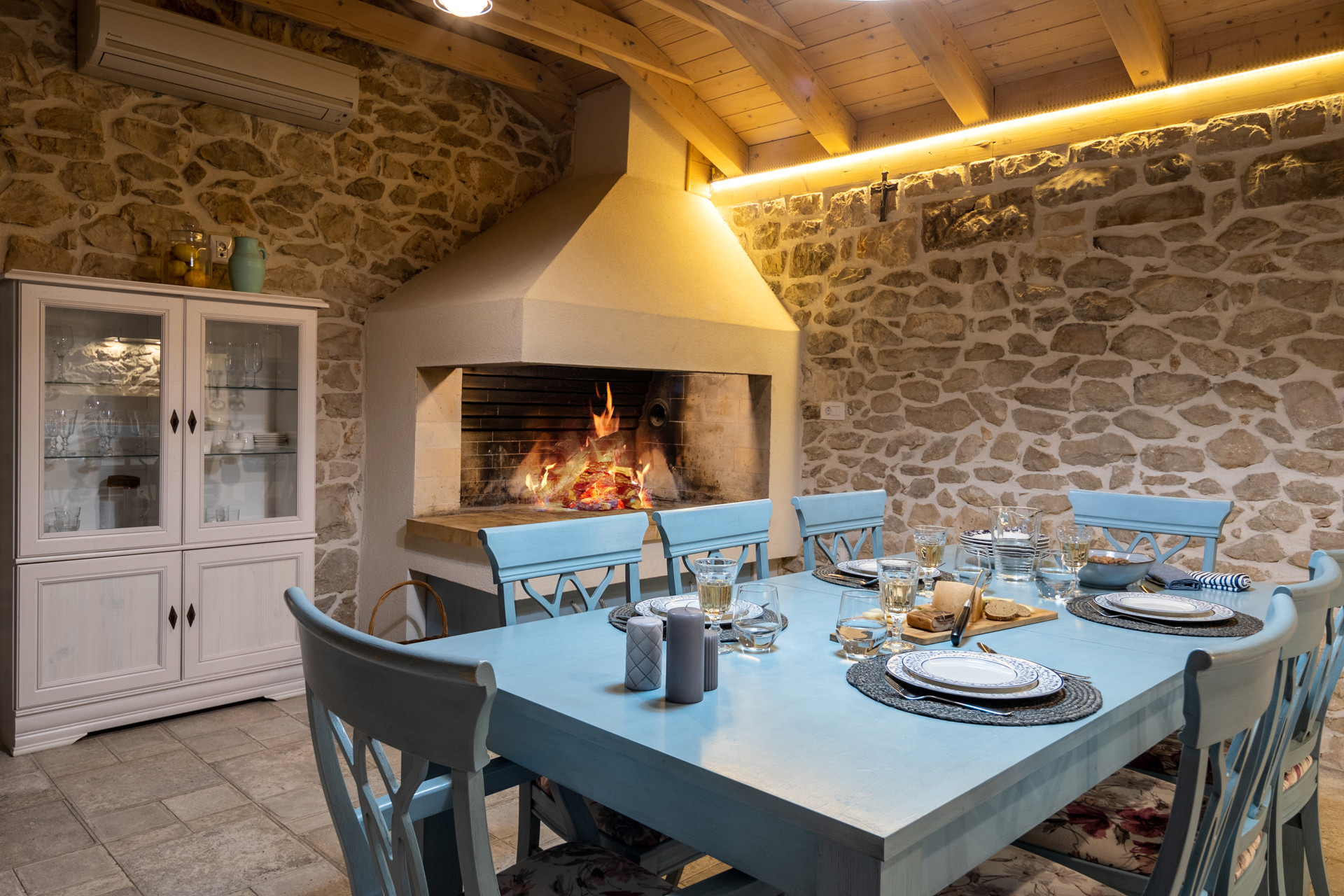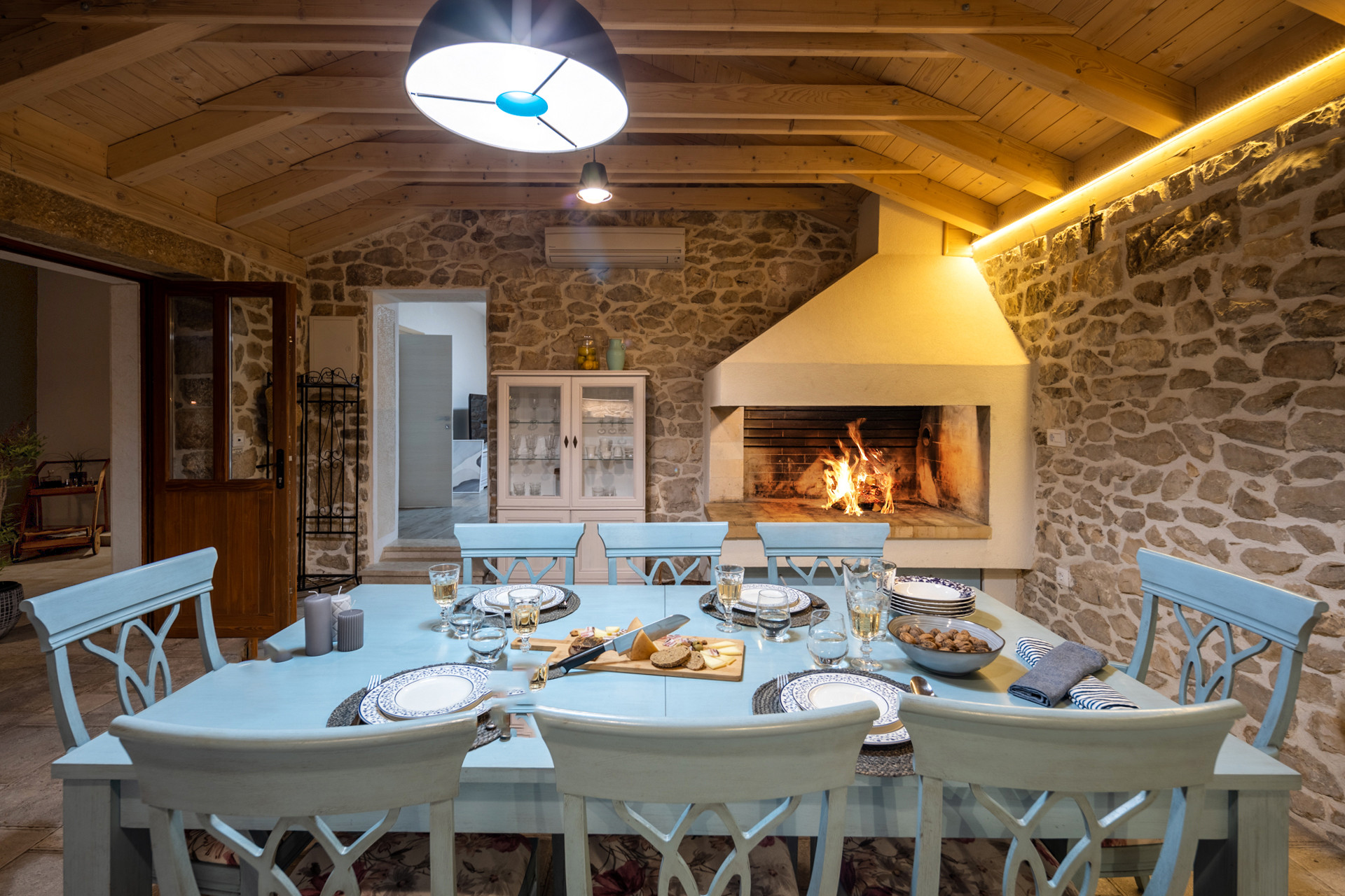 The living room is equipped with a sofa bed for two extra guests, satellite TV, and Netflix for endless entertainment. Next to it, a fully equipped kitchen with modern appliances and a traditional indoor fireplace opens into a cozy dining area, making it ideal for shared meals and gatherings.