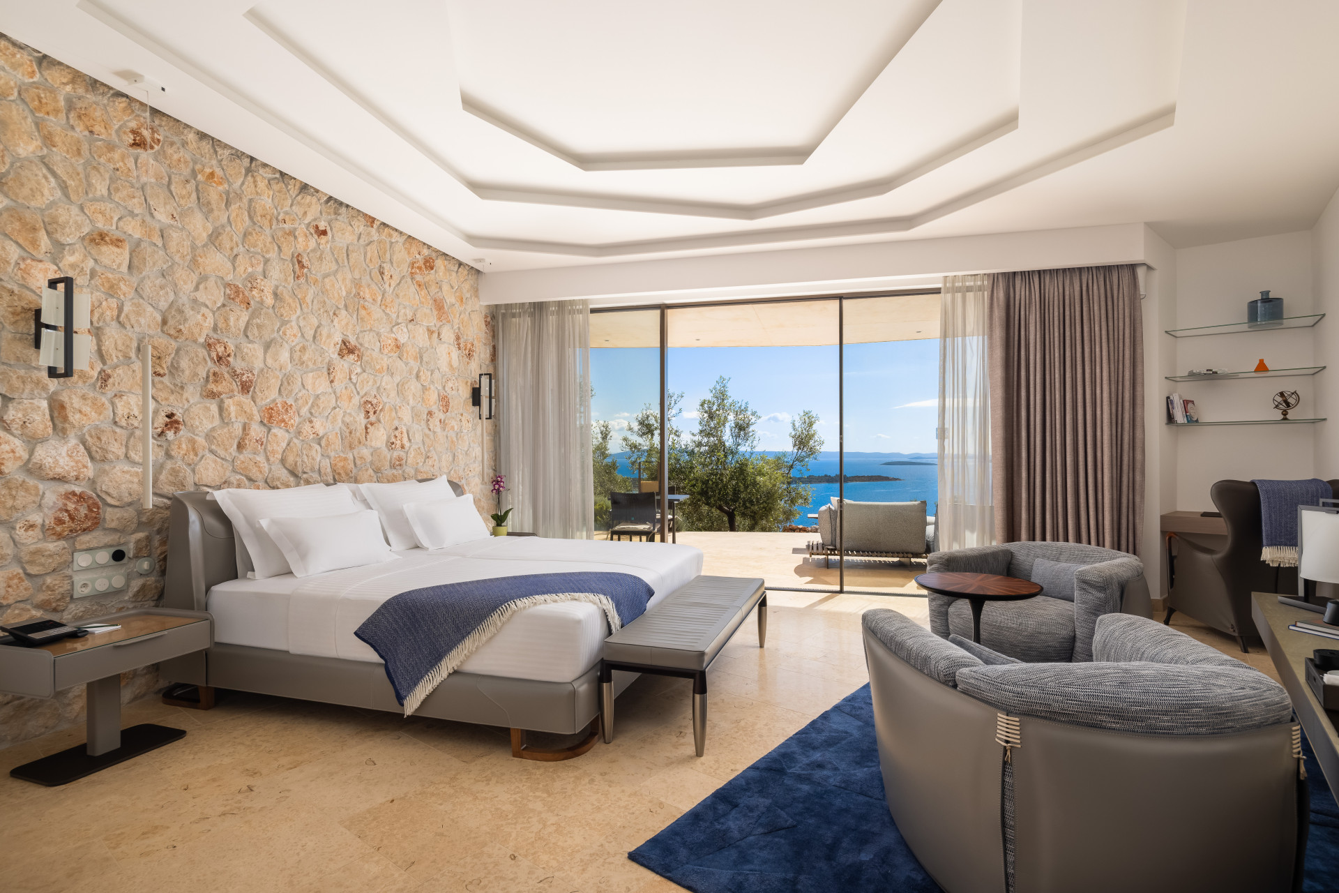 Guests can choose to rent a Deluxe room or Deluxe Suite or exclusively lease the entire estate for up to 16 people. The property offers Deluxe Rooms with sea or olive grove views, as well as Deluxe Suites with sea or olive grove views. Bed and breakfast for two people is included, and if you rent the entire villa, bed and breakfast is provided for 16 people.